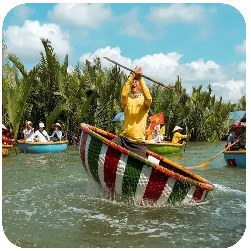 Glide through the coconut groves of Cam Thanh Village on a traditional basket boat, try crab-catching and net casting with local fishermen, and learn the art of lantern making. The tour ends with a walk through Hoi An Ancient Town, a UNESCO site known for its historic bridge, temples, and charming streets.