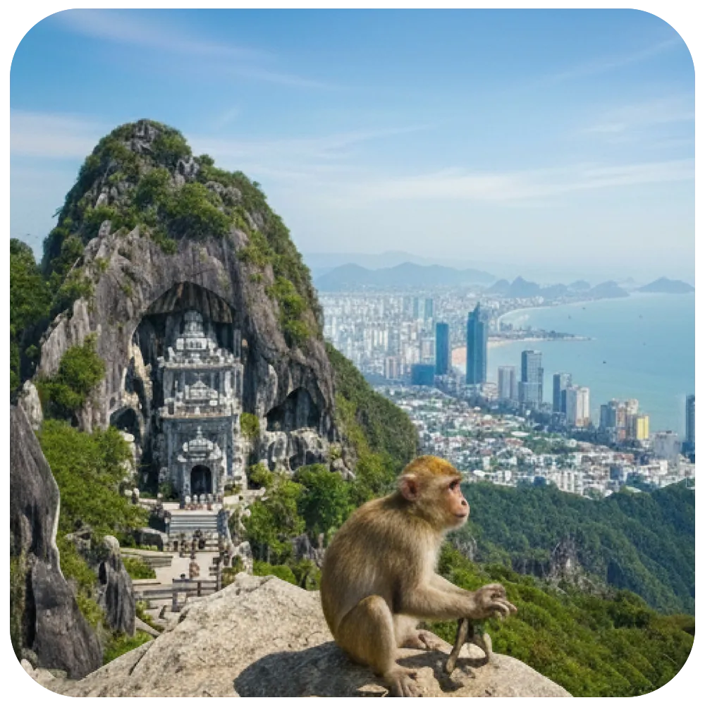 Visit the Marble Mountains, with caves, shrines, and sweeping viewpoints, then continue to Monkey Mountain for panoramic views of Da Nang and the coastline.