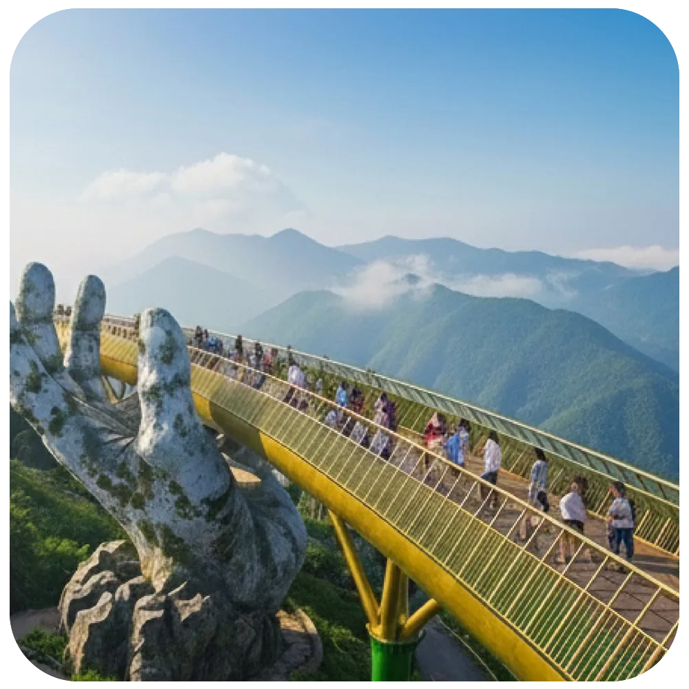 Ride one of Asia’s longest cable cars to the famous Golden Bridge, held by giant stone hands at 4,878 feet above sea level. Explore the French Village, enjoy a buffet lunch, and try fun activities at the Fantasy Park and mountain resort.